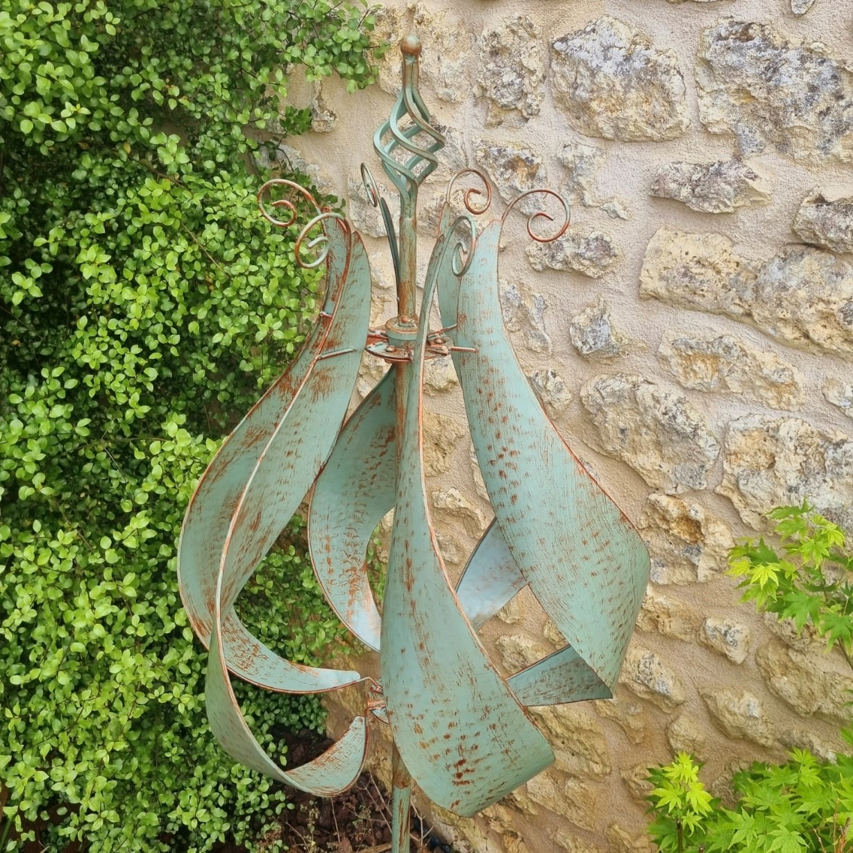 Wunderschöne und zeitgemäße dekorative Gartenwindmühle CHEVERNY in gealtertem Grün/Gold wird Sie begeistern. Als Savonius-Typ startet unsere Windmühle bereits bei schwachem Wind. Ausgestattet mit 4 dichtgelagerten Kugellagern ist diese Metall-Gartendekoration sehr robust. Entdecken Sie auch unser Modell OLÉRON