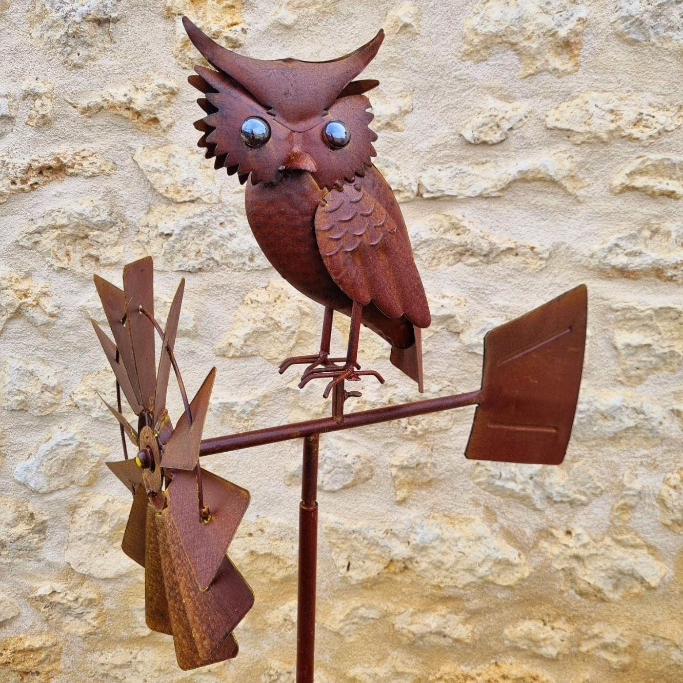 Praktisch und dekorativ: der Rankstab, dekorative Gartenwindmühle mit Eulenmotiv in Rostoptik