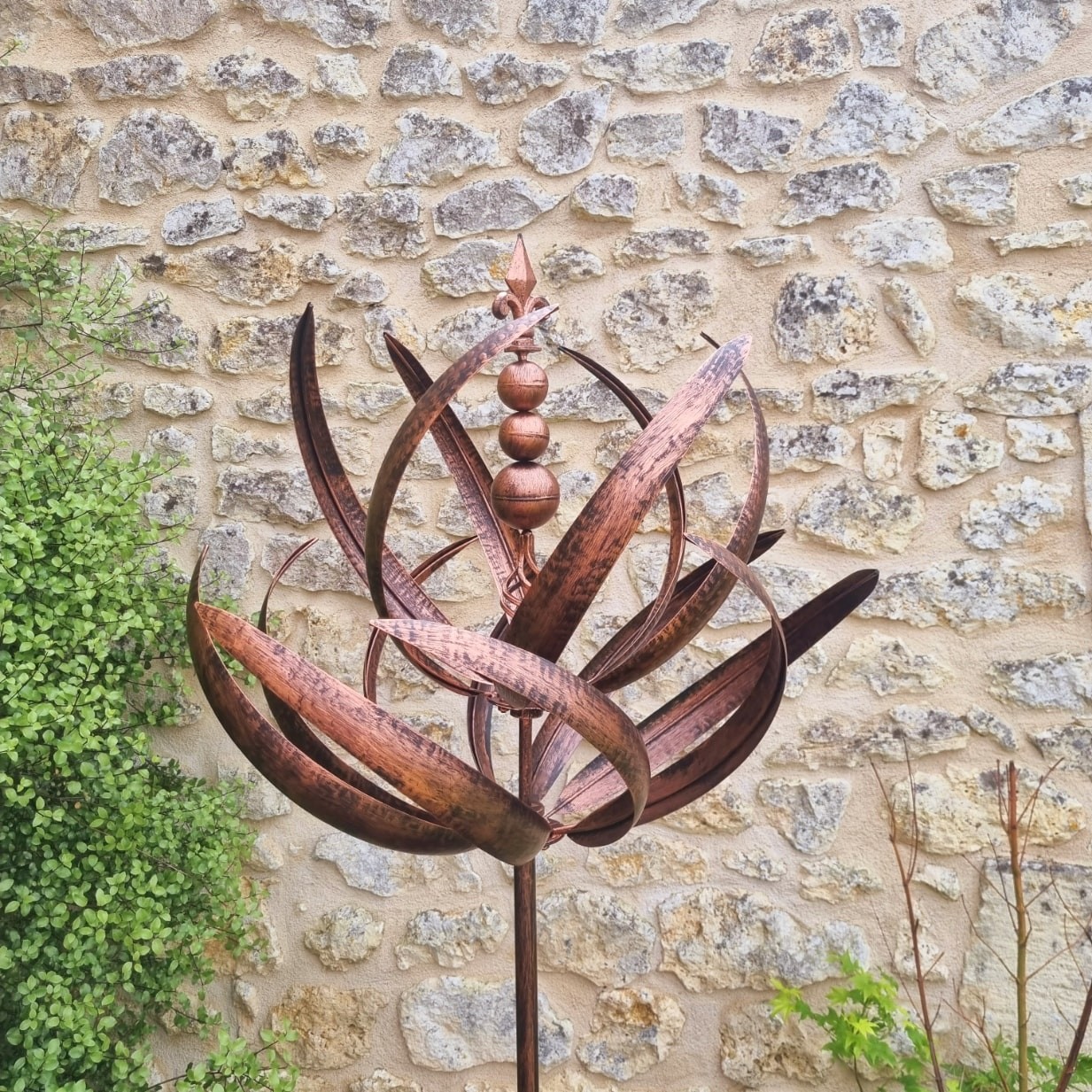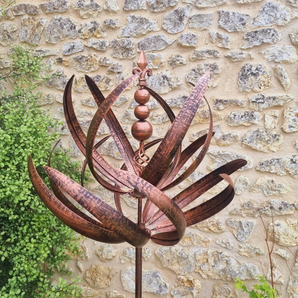 Wunderschöne und zeitgemäße dekorative Gartenwindmühle CHANTILLY in kupferfarbener Ausführung besticht durch ihr Lilien-Design. Als Savonius-Typ startet diese Windmühle bei schwachem Wind geräuschlos. Mit ihren doppelt angeordneten Flügeln und vier wasserdichten Lagern bietet diese robuste dekorative Gartenwindmühle Ihrem Garten ein wahres Augenhighlight durch ihre entgegengesetzten Bewegungen. Entdecken Sie auch unser Modell LANGEAIS