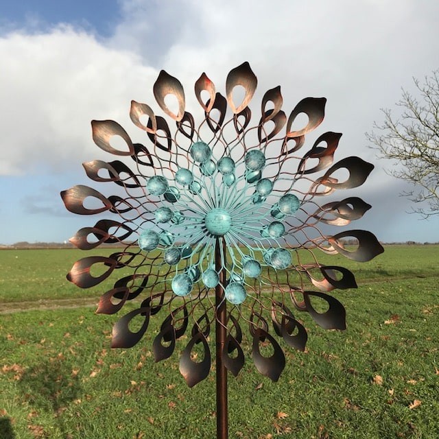 Avec son axe horizontal, cette éolienne girouette s’oriente naturellement face au vent, offrant à la fois un spectacle apaisant et une indication pratique de la direction du vent. Ses pales aux nuances cuivrées et patinées jouent avec la lumière, créant un effet visuel unique qui s’adapte à tous les styles de jardin.